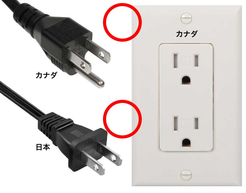 カナダは日本と同じタイプAと、アースピンが付いたタイプBのコンセントが混在しています。日本のプラグ(タイプA)はそのまま差し込むことができ、タイプBにも問題なく使用可能です。
