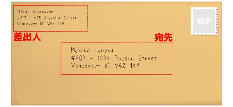 カナダ国内に送る場合は「Canada」と書く必要はありません。差出人を左上に、宛先を中央に書けば十分です。