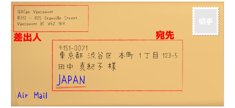 ただし、カナダの郵便局が海外郵便であると判断できるように、宛先には必ず「Japan」と記載してください。青や赤のペンで目立たせるとさらに確実です。